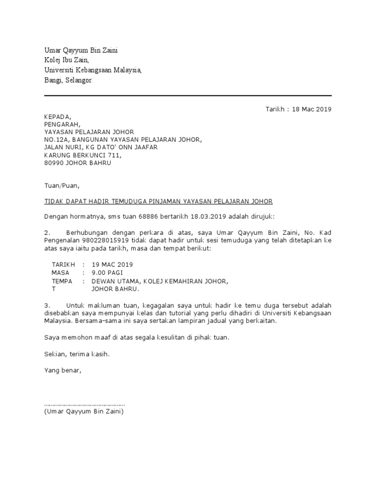 Contoh Surat Rasmi Tidak Dapat Hadir Ke Temuduga